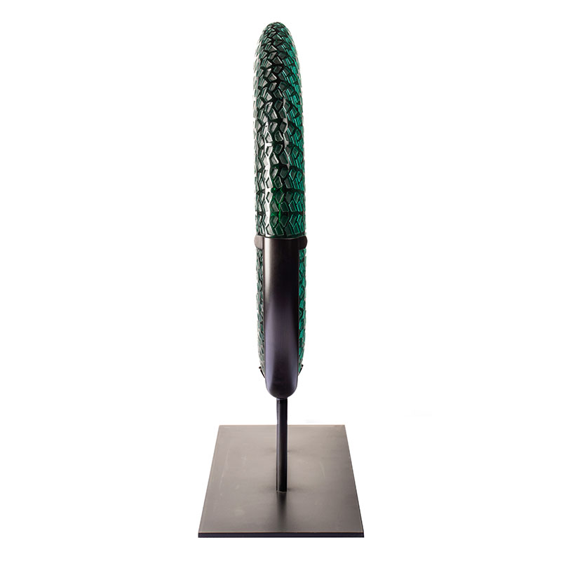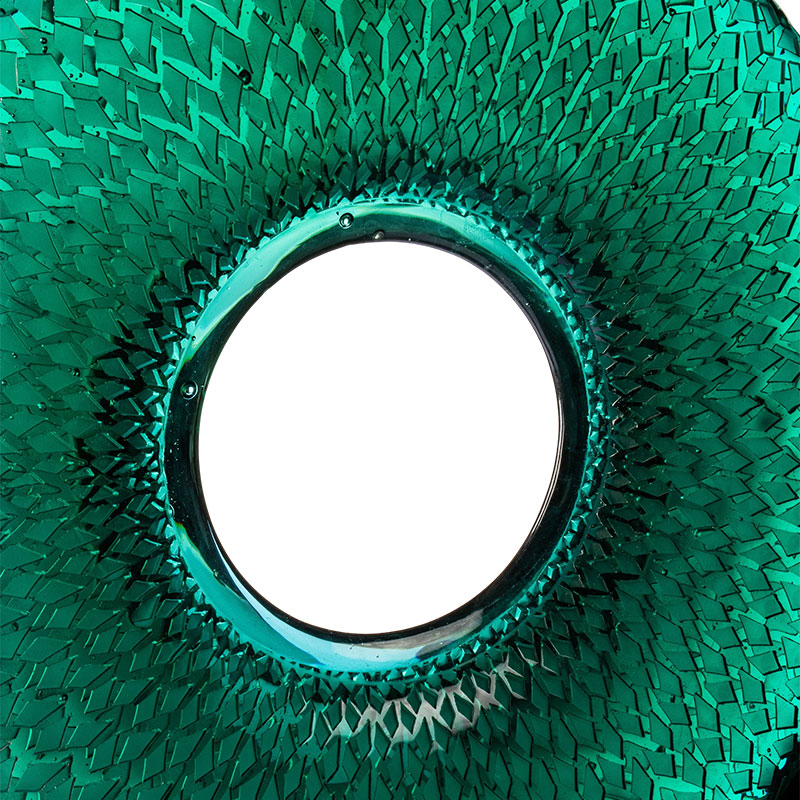 Lucrarea ia frunzele de bambus ca inspirație naturală, captând spiritul eteric al bambusului verde care se legănă în briza pădurii. Prin transluciditatea sticlei, evocă o mie de reflexe strălucitoare de bambus. Această nuanță de albastru verzi întruchipează atât prospețimea plantațiilor de bambus înainte ca roua dimineții să se evapore, cât și grația blândă a trecerii timpului. Modelele complicate, precum venele de frunze de bambus care se desfășoară, se ondula cu straturi de lumină în timp ce dansează pe suprafață, captând spiritul sălbatic al muntelui în cadrul circular.
